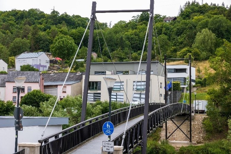Die Radweg- und Fußgängerbrücke in Langsur-Metzdorf hat trotz der enormen Kräfte, die auf sie einwirkten, standgehalten. Große Schäden richtete das Hochwasser allerdings in Langsur an. Fotos: Andreas Bauer
